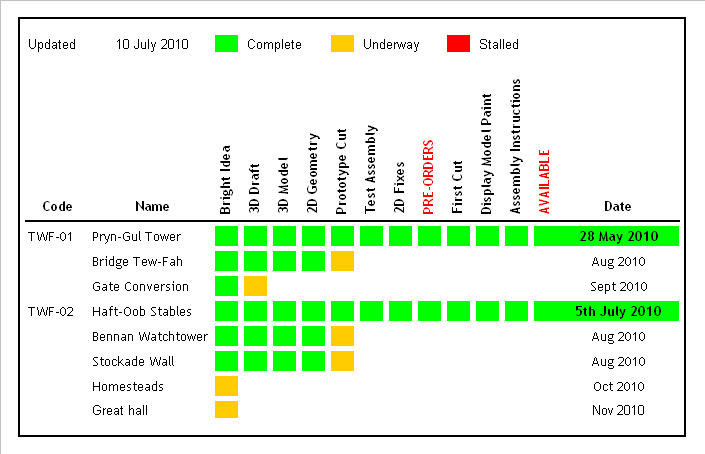 The good news is I've managed to communicate with Fenris Games now their Salute backlog is cleared and I hope to place an order for PrynGul kits (here forth known as TWP01) in the next week or so, and the prototype kits for the Stables (TWP02) will get cut in the same batch! If I get better at this I shall have to add likely release dates to the progress chart!