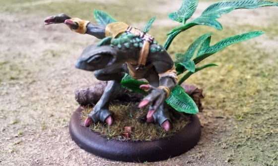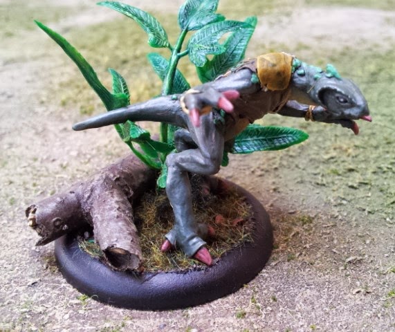 Finished this Devanu Sempa last night. I went for a green skin as I like my miniatures to be forest-based. So it seems only natural for a predator to change skin-colour a bit over a large period of time. .jpg) .jpg) .jpg) The base is a bit crowded as I wanted her to look as if she just sprung from the forest to assail her prey. I'm not entirely happy with her, but I can't put my finger on it. Time will probably tell. The pictures aren't as sharp as they should be, I should try a different setting on my camera next time.