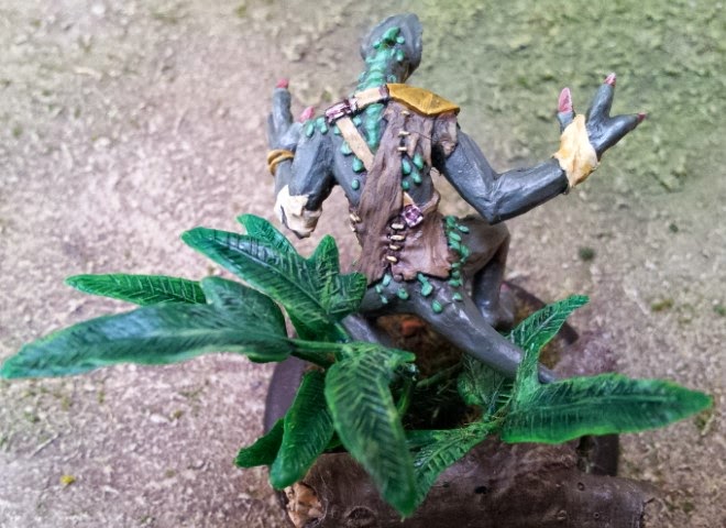 I went for a green skin as I like my miniatures to be forest-based. So it seems only natural for a predator to change skin-colour a bit over a large period of time.