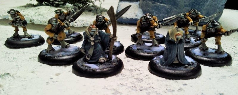 those look great. I especially like the light colored hoods on the acolytes and the raw metal on the armor. those colors combined with the nice black rimmed snow bases create a spartan picture of Delgon society.